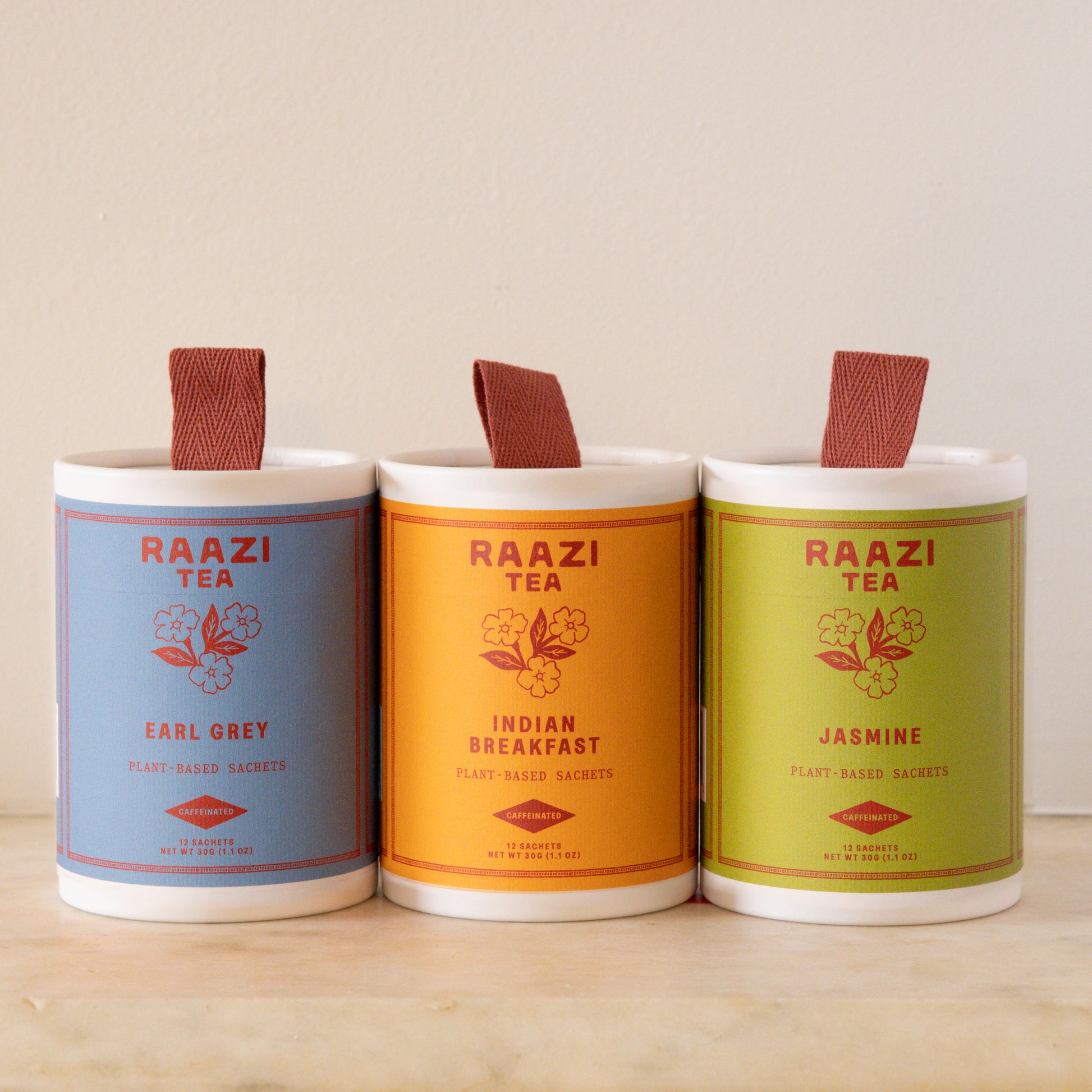 A bundle of our favorite caffeinated teas—Indian Breakfast, Earl Grey, Jasmine.